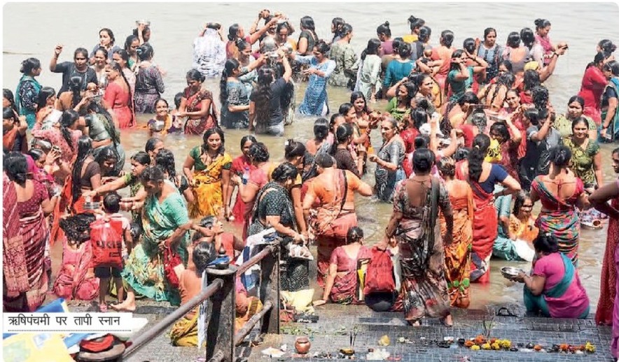 सूरत. गणपति स्थापना के अगले दिन भाद्रपद शुक्ल पंचमी बुधवार को ऋषि पंचमी पर्व से मनाया गया। इस मौके पर शहर के विभिन्न क्षेत्रों में श्रद्धालुओं ने सप्तऋषि की विधि-विधान से पूजा-अर्चना और आरती की व कहानियां सुनी। इसके अलावा शहर में तापी नदी के विभिन्न क्षेत्र स्थित घाटों पर श्रद्धालु महिलाओं ने तापी-तापी-महातापी.. के जाप के साथ डुबकियां लगाकर घर-परिवार, समाज में खुशहाली की कामना व्यक्त की। तापी नदी के वराछा स्थित सिद्धकुटीर घाट समेत अन्य घाटों पर बुधवार सुबह तापी स्नान, ऋषि पूजन के आयोजन हुए। वहीं, डिंडोली स्थित गोकुलधाम सोसायटी में श्रद्धालु महिलाओं ने सप्तऋषि की स्थापना कर विधिविधान से पूजा की।