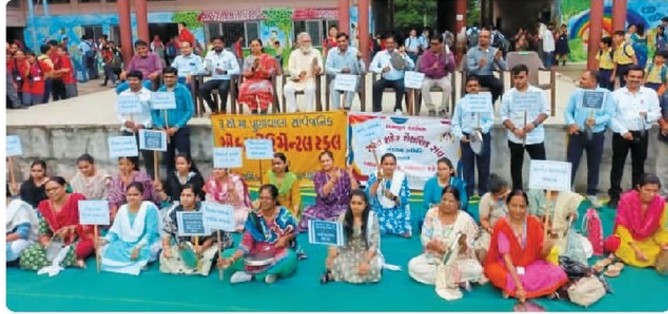 teachers’ demonstration:सूरत. अठवा लाइंस स्थित एक अनुदानित स्कूल में सोमवार को शिक्षकों ने थाली बजाकर सरकार को जगाने का प्रयास किया। इससे पहले अठवा लाइंस स्थित चौपाटी में पिछले शनिवार को सूरत शहर शैक्षणिक संघ संकलन समिति ने रामधून कर विरोध प्रदर्शन किया था। राज्य में जगह जगह शिक्षकों के संघ प्रदर्शन कर विरोध जता रहे हैं। गुजरात के शिक्षक लंबे समय से अपनी मांगों को लेकर सरकार को गुजारिश कर रहे हैं। स्कूलों में रिक्त पड़े स्थानों पर नियुक्ति, शिक्षकों को पढ़ाई के अलावा सौंपे जा रहे कार्यों से दूर रखने के अलावा अन्य कई मांगों को लेकर सरकार से बार-बार अपील की जा रही है। शिक्षकों का आरोप है कि उनकी मांगों पर अभी तक किसी तरह की कार्रवाई नहीं की गई है।