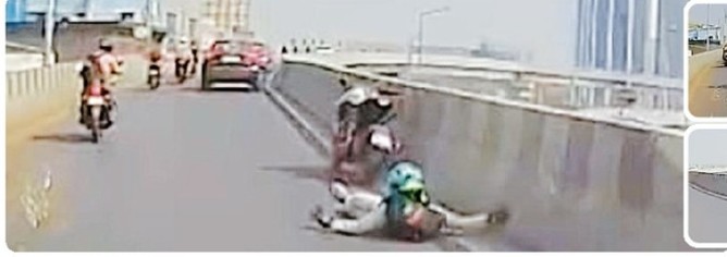 सूरत. शहर के रिंगरोड फ्लाई ओवरब्रिज पर रविवार सुबह एक मोटरसाइकिल सवार तेज रफ्तार से जाते समय असंतुलित होकर ब्रिज के रेलिंग से टकरा गया। हादसे में मोटरसाइकिल सवार रेलिंग पर आधा नीचे की तरफ झुक गया, लेकिन गनीमत रही कि वह ब्रिज पर ही सडक़ पर गिरा। इस दौरान उसकी मोटरसाइकिल रेलिंग से टकराने के बाद कम से कम 100 मीटर तक चलते हुए आगे जाकर गिर गई। यह पूरी घटना कार में सवार एक व्यक्ति द्वारा वीडियो बनाए जाने के दौरान कैद हो गई। सुबह 9 बजकर 55 मिनट पर यह हादसा हुआ। हादसे का वीडियो दिनभर में शहर में वायरल हो गया और लोगों को के बीच फ्लाई ओवरब्रिज पर दुपहिया वाहन चालकों की गति सीमा को लेकर कई तरह की चर्चा शुरू हो गई।