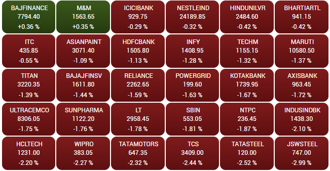 सोमवार को बाजार बंद होने के दौरान सेंसेक्स के 30 शेयरों का हाल