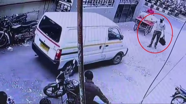 सीसीटीवी फुटेज में दिख रहा है कि एक इको कार सड़क पर जा रही है. तभी उसके सामने हाथ में ब्रीफकेस लिए और सर पर टोपी पहने एक शख्स आ जाता है. वह ईको कार चालक को हाथ दिखाते हुए रोकने के लिए कहता है. कार के रुकने पर हाथ में ब्रीफकेस लिए बदमाश कार का दरवाजा खोलता है.