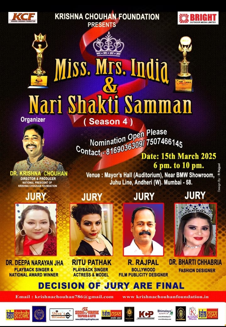केसीएफ फाउंडेशन के बैनर तले बॉलीवुड के मशहूर निर्माता निर्देशक डॉ कृष्णा चौहान द्वारा मिस मिसेज इंडिया एंड नारी शक्ति सम्मान समारोह 2025 (सीज़न 4) का आयोजन मुम्बई के मेयर हॉल में 15 मार्च को किया जाएगा। इस सम्मान समारोह के ज्यूरी सदस्यों में डॉ दीपा नारायण झा, सिंगर ऋतु पाठक, पब्लिसिटी डिज़ाइनर आर राजपाल और फ़ैशन डिज़ाइनर भारती छाबड़िया हैं। इसका नॉमिनेशन जारी है। इस कार्यक्रम में बॉलीवुड के नामचीन अभिनेता, अभिनेत्री, निर्देशक, संगीतकार एवं समाज सेवा के क्षेत्र में एक्टिव शख्सियतों की उपस्थिति में चुने गए प्रतिभागियों को सम्मानित किया गया जाएगा जो नारी शक्ति का जीता जागता उदाहरण हैं। गोरखपुर (यूपी) के मूल निवासी डॉ कृष्णा चौहान पिछले 23 वर्षों से बॉलीवुड में सक्रिय हैं। इन्होंने अपना फिल्मी सफर बतौर सहयक निर्देशक शुरू किया था। इन्होंने कई एड फिल्म्स, म्यूजिक वीडियो का निर्माण किया है। समाज सेवा के क्षेत्र में एक्टिव रहते हुए डॉ कृष्णा चौहान प्रत्येक वर्ष मुंबई में आधा दर्जन से अधिक पुरूस्कार समारोहों का आयोजन करते हैं जिसमें प्रतिष्ठित समाजसेवकों सहित उद्योगपति, डॉक्टर, पुलिस, प्रशासनिक अधिकारी, वकील, पत्रकार एवं बॉलीवुड से जुड़े कलाकार, टेक्नीशियन को भी सम्मानित किया जाता है।