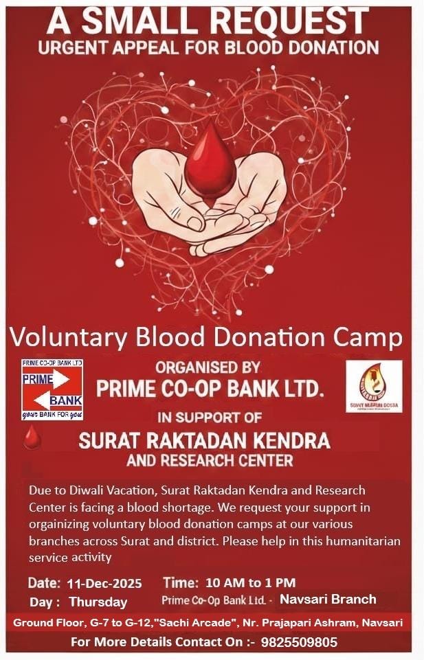 рдирд╡рд╕рд╛рд░реА рдореЗрдВ Prime Co-Op Bank Ltd. рджреНрд╡рд╛рд░рд╛ рдПрдХ рдорд╣рддреНрд╡рдкреВрд░реНрдг Voluntary Blood Donation Camp рдЖрдпреЛрдЬрд┐рдд рдХрд┐рдпрд╛ рдЬрд╛ рд░рд╣рд╛ рд╣реИред рджрд┐рд╡рд╛рд▓реА рдЕрд╡рдХрд╛рд╢ рдХреЗ рдмрд╛рдж Surat Raktadan Kendra and Research Center рдореЗрдВ рд░рдХреНрдд рдХреА рдХрдореА рдХреЛ рдзреНрдпрд╛рди рдореЗрдВ рд░рдЦрддреЗ рд╣реБрдП рдпрд╣ рдЬрдирд╣рд┐рдд рдЕрднрд┐рдпрд╛рди рд╢реБрд░реВ рдХрд┐рдпрд╛ рдЧрдпрд╛ рд╣реИред