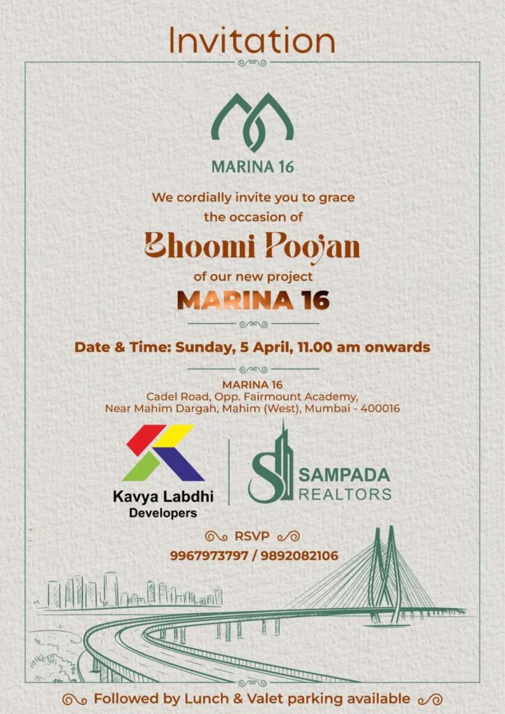 рдореБрдореНрдмрдИ рд╕реЗ рдПрдХ рдмреЗрд╣рдж рд╢реБрдн рдФрд░ рдЧреМрд░рд╡рдкреВрд░реНрдг рд╕рдорд╛рдЪрд╛рд░ рд╕рд╛рдордиреЗ рдЖрдпрд╛ рд╣реИ, рдЬрд╣рд╛рдБ рдХрд▓ тАШMARINA 16тАЩ рдирд╛рдордХ рдПрдХ рднрд╡реНрдп рд░реЗрд╕рд┐рдбреЗрдВрд╢рд┐рдпрд▓ рдЯреЙрд╡рд░ рдкрд░рд┐рдпреЛрдЬрдирд╛ рдХрд╛ рднреВрдорд┐ рдкреВрдЬрди (рдЧреНрд░рд╛рдЙрдВрдбрдмреНрд░реЗрдХрд┐рдВрдЧ рд╕реЗрд░реЗрдордиреА) рдЕрддреНрдпрдВрдд рджрд┐рд╡реНрдп рдФрд░ рднрд╡реНрдп рд╡рд╛рддрд╛рд╡рд░рдг рдореЗрдВ рд╕рдВрдкрдиреНрди рд╣реБрдЖред